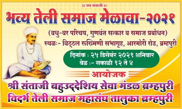 श्री संताजी बहुउद्देशिय सेवा मंडळ ब्रम्हपुरी र.नं. महा/६६/२०१२ (चं) जि. चंद्रपूर व विदर्भ तेली समाज महासंघ तालुका ब्रम्हपुरी यांचे संयुक्त विद्यमाने आयोजीत तेली समाज वधू-वर परिचय, प्रबोधन व सत्कार मेळावा २०२१