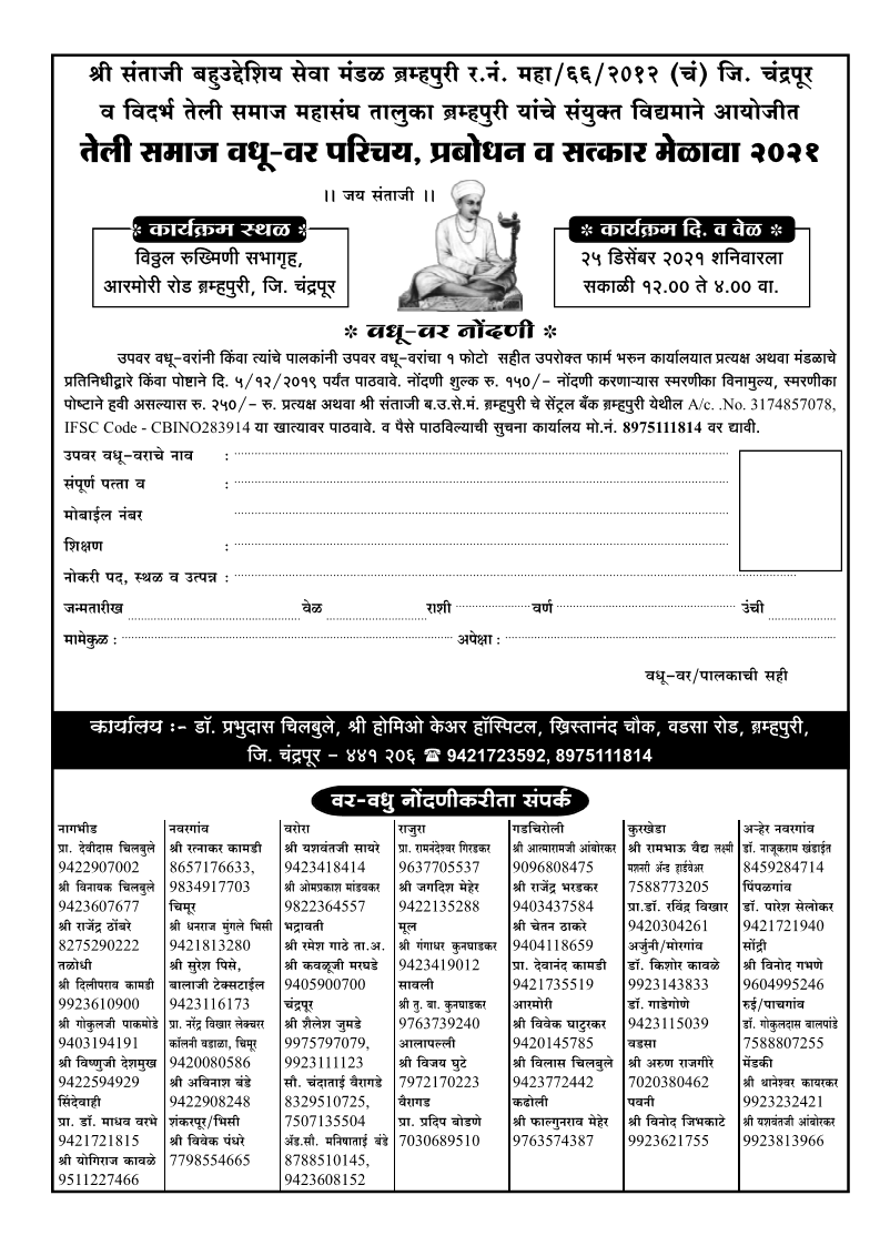 वर - वधु नोंदणीकरीता संपर्क - नागभीड प्रा. देवीदास चिलबुले 9422907002 श्री विनायक चिलबुले 9423607677 श्री राजेंद्र ठोंबरे 8275290222 तळोधी श्री दिलीपराव कामडी 9923610900 श्री गोकुलजी पाकमोडे 9403194191 श्री विष्णुजी देशमुख 9422594929 सिंदेवाही प्रा. डॉ. माधव वरभे 9421721815 श्री योगिराज कावळे 9511227466 नवरगांव श्री रत्नाकर कामडी 8657176633, 9834917703 चिमूर श्री धनराज मुंगले भिसी 9421813280 श्री सुरेश पिसे, बालाजी टेक्सटाईल 9423116173 प्रा. नरेंद्र विखार लेक्चरर कॉलनी वडाळा, चिमूर 9420080586 श्री अविनाश बंडे 9422908248 शंकरपूर/भिसी श्री विवेक पंधरे 7798554665 बरोरा श्री यशवंतजी सायरे 9423418414 श्री ओमप्रकाश मांडवकर 9822364557 भद्रावती श्री रमेश गाठे ता.अ. श्री कवळूजी मरघडे 9405900700 चंद्रपूर श्री शैलेश जुमडे 9975797079, 9923111123 सौ. चंदाताई वैरागडे 8329510725, 7507135504 अॅड.सौ. मनिषाताई बंडे 8788510145, 9423608152 राजुरा प्रा. रामनंदेश्वर गिरडकर 9637705537 श्री जगदिश मेहेर 9422135288 मूल श्री गंगाधर कुनघाडकर 9423419012 सावली श्री तु. बा. कुनघाडकर 9763739240 आलापल्ली श्री विजय घुटे 7972170223 वैरागड प्रा. प्रदिप बोडणे 7030689510 गडचिरोली श्री आत्मारामजी आंबोरकर |9096808475 श्री राजेंद्र भरडकर 9403437584 श्री चेतन ठाकरे |9404118659 प्रा. देवानंद कामडी 9421735519 आरमोरी श्री विवेक घाटुरकर |9420145785 श्री विलास चिलबुले 9423772442 कढोली श्री फाल्गुनराव मेहेर 9763574387 कुरखेडा श्री रामभाऊ वैद्य लक्ष्मी मशनरी अँन्ड हार्डवेअर 7588773205 प्रा.डॉ. रविंद्र विखार 9420304261 अर्जुनी/मोरगांव डॉ. किशोर कावळे 9923143833 डॉ. गाडेगोणे 9423115039 वडसा श्री अरुण राजगीरे 7020380462 पवनी श्री विनोद जिभकाटे 9923621755 अन्हेर नवरगांव डॉ. नाजूकराम खंडाईत 8459284714 पिंपळगांव डॉ. पारेश सेलोकर |9421721940 सोंद्री श्री विनोद गभणे 9604995246 रुई/पाचगांव डॉ. गोकुलदास बालपांडे 7588807255 मेंडकी श्री थानेश्वर कायरकर |9923232421 श्री यशवंतजी आंबोरकर 9923813966
