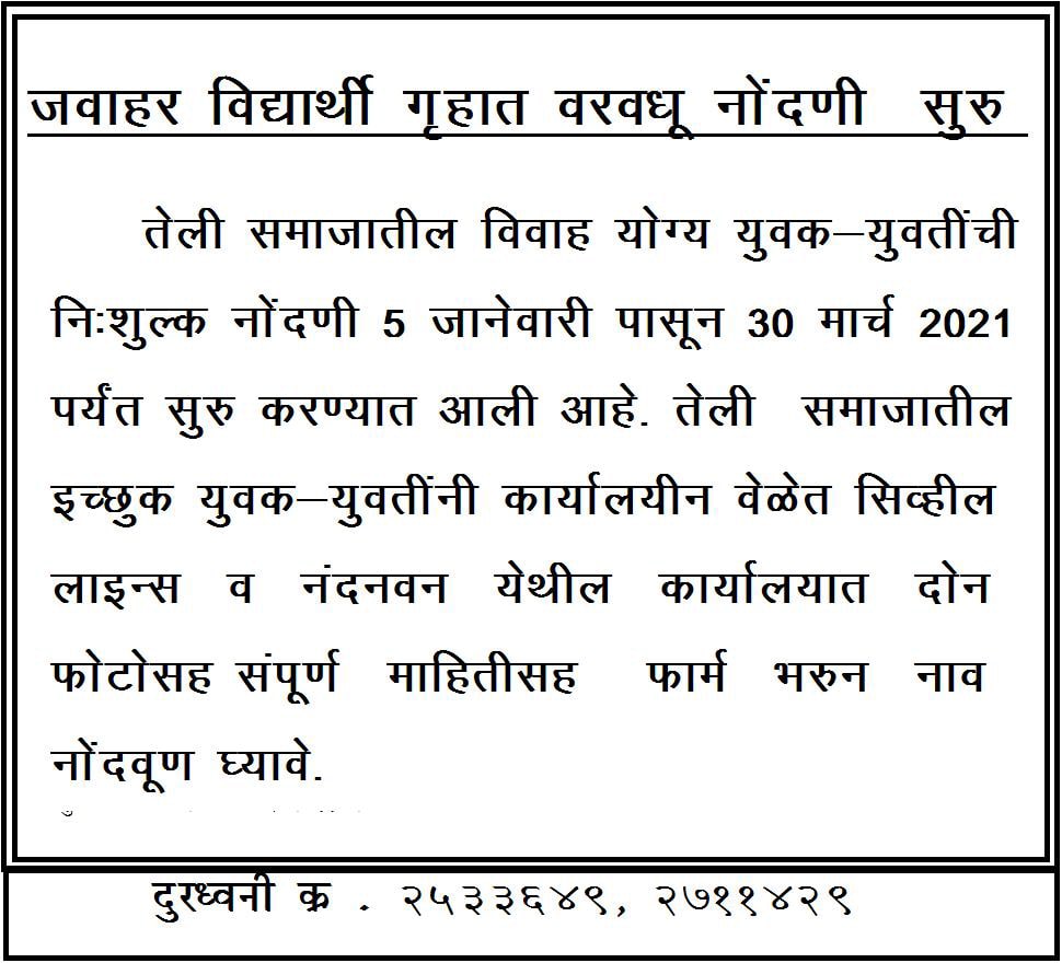रोड आरक्षण रद्द करण्याची मागणी श्री संत संताजी जगनाडे महाराज यांची समाधी पुणे येथील चाकण जवळ सदंबरेला असून समाधी स्थळावर संस्थेची ५ एकर जागा आहे. या जागेतून १८ मीटर डी.पी. रोडचे आरक्षण शासनाने केले आहे. त्यामुळे समाधी स्थळाचे विद्रुपीकरण होईल करिता शासनाने ठरविलेले आरक्षण त्वरित रद्द करण्यात यावे, अशी मागणी कार्याध्यक्ष डॉ. यशवंत खोब्रागडे यांनी समितीतर्फे केली. जन्मोत्सव सोहळ्यात समिती सचिव अनिल ढोबळे, कैलास गायधने, चंद्रशेखर खते, हर्षद बेले, डॉ. गोपाल वाघमारे, डॉ. राम कोल्हे, डॉ. गुंजन देशमुख इत्यादी पदाधिकारी उपस्थित होते.