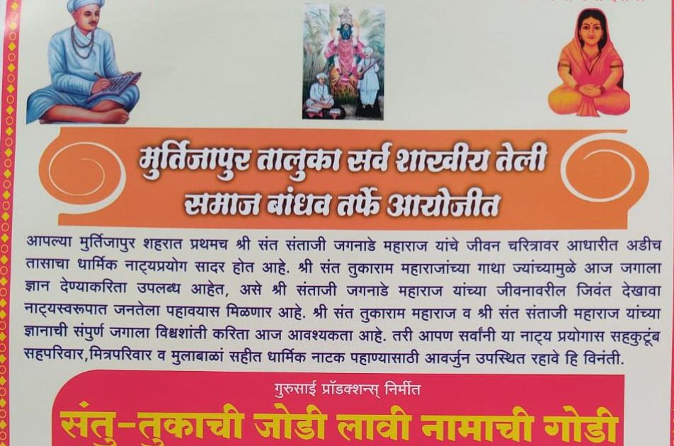 मुर्तिजापुर तालुका सर्व शाखीय तेली समाज बांधव तर्फे आयोजीत शहरात प्रथमच श्री संत संताजी जगनाडे महाराज यांचे जीवन चरित्रावर आधारीत अडीच तासाचा धार्मिक नाट्यप्रयोग सादर होत आहे. श्री संत तुकाराम महाराजांच्या गाथा ज्यांच्यामुळे आज जगाला ज्ञान देण्याकरिता उपलब्ध आहेत, असे श्री संताजी जगनाडे महाराज यांच्या जीवनावरील जिवंत देखावा नाट्यस्वरूपात जनतेला पहावयास मिळणार आहे. श्री संत तुकाराम महाराज व श्री संत संताजी महाराज यांच्या ज्ञानाची संपुर्ण जगाला विश्वशांती करिता आज आवश्यकता आहे. तरी सर्वांनी या नाट्य प्रयोगास सहकुटूंब, सहपरिवार, मित्रपरिवार व मुलाबाळां सहीत धार्मिक नाटक पहाण्यासाठी आवर्जुन उपस्थित रहावे हि विनंती करण्यात आली आहे.