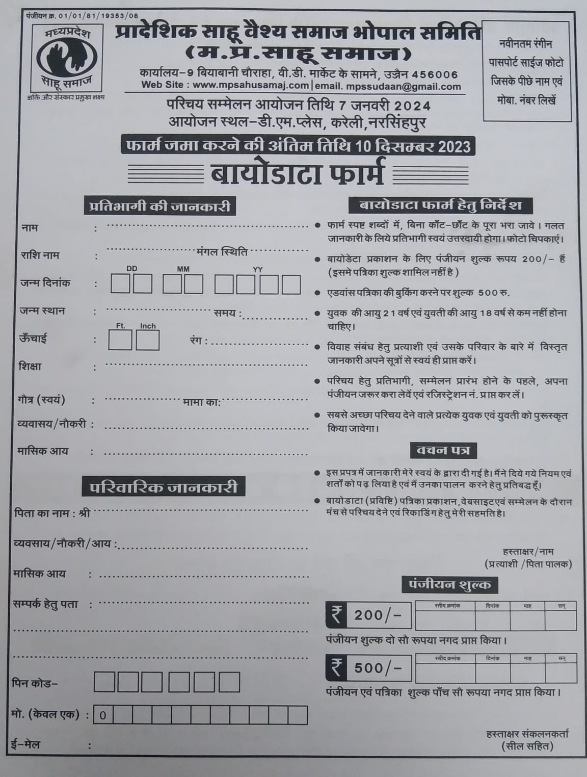 प्रादेशिक साहू वैश्य समाज भोपाल समिति मध्य प्रदेश साहू समाज कार्यालय-9 बियाबानी चौराहा, वी.डी. मार्केट के सामने, उज्जैन 456006 परिचय सम्मेलन आयोजन तिथि 7 जनवरी 2024 आयोजन स्थल-डी.एम. प्लेस, करेली, नरसिंहपुर, फार्म जमा करने की अंतिम तिथि 10 दिसम्बर 2023 बायोडाटा फार्म बायोडाटा फार्म हेतु निर्देश फार्म स्पष्ट शब्दों में, बिना काँट-छाँट के पूरा भरा जावे। गलत जानकारी के लिये प्रतिभागी स्वयं उत्तरदायी होगा। फोटो चिपकाएं। युवक की आयु 21 वर्ष एवं युवती की आयु 18 वर्ष से कम नहीं होना चाहिए। विवाह संबंध हेतु प्रत्याशी एवं उसके परिवार के बारे में विस्तृत | जानकारी अपने सूत्रों से स्वयं ही प्राप्त करें। परिचय हेतु प्रतिभागी, सम्मेलन प्रारंभ होने के पहले, अपना | पंजीयन जरूर करा लेवें एवं रजिस्ट्रेशन नं. प्राप्त कर लें।
